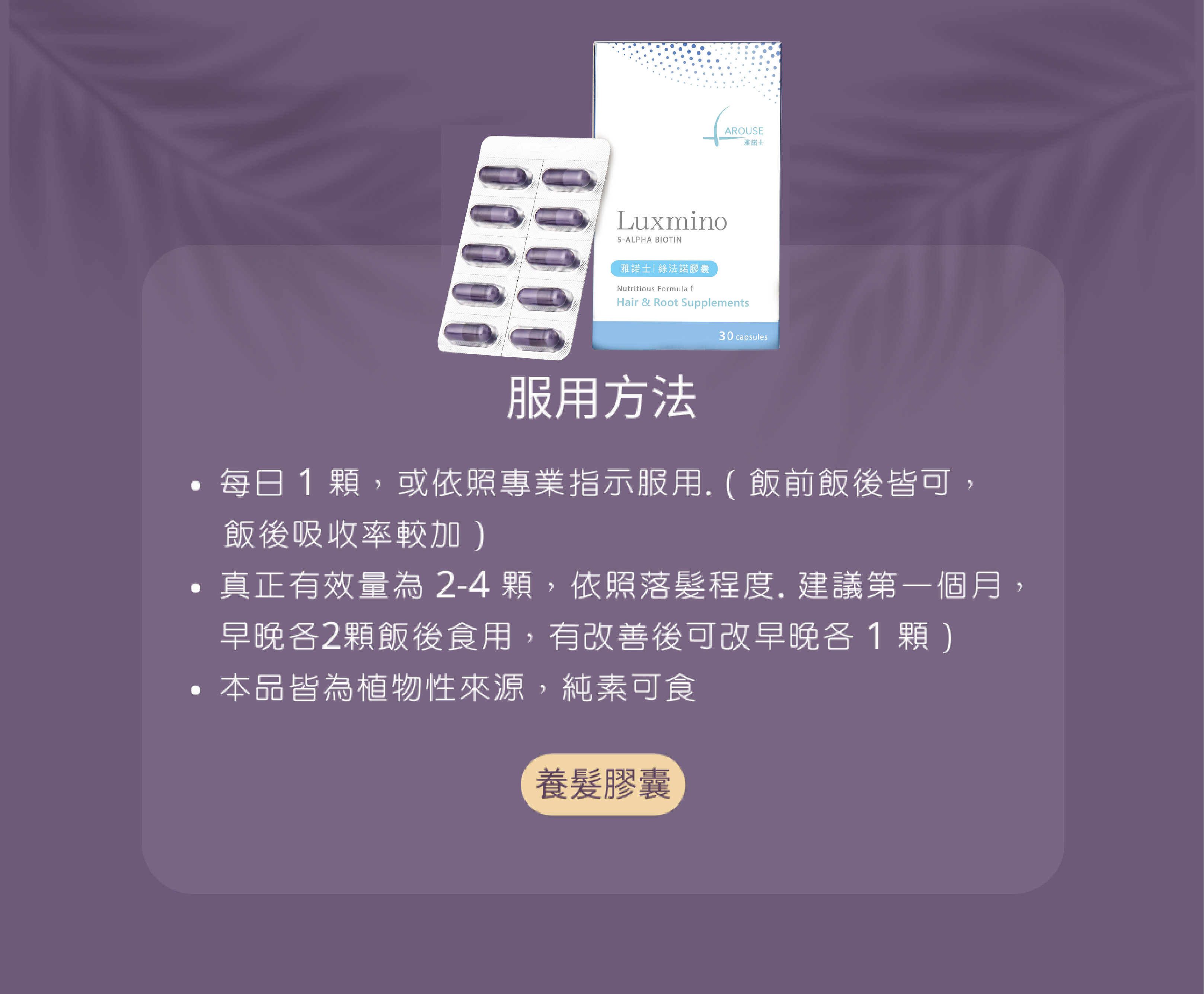 每日用量:一日一顆或依照專業保健指示使用,多食無益。